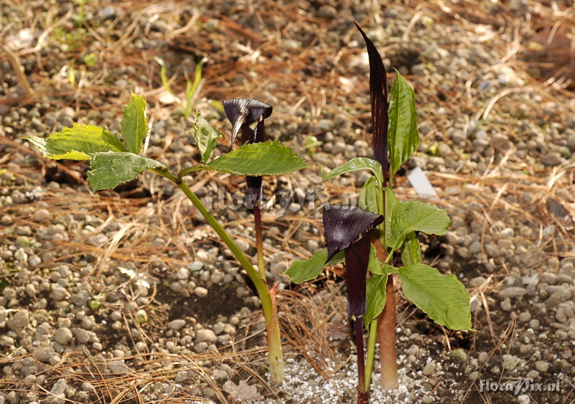 : A clump with dark purple spathes (tubers from Chen nursery as A.28)