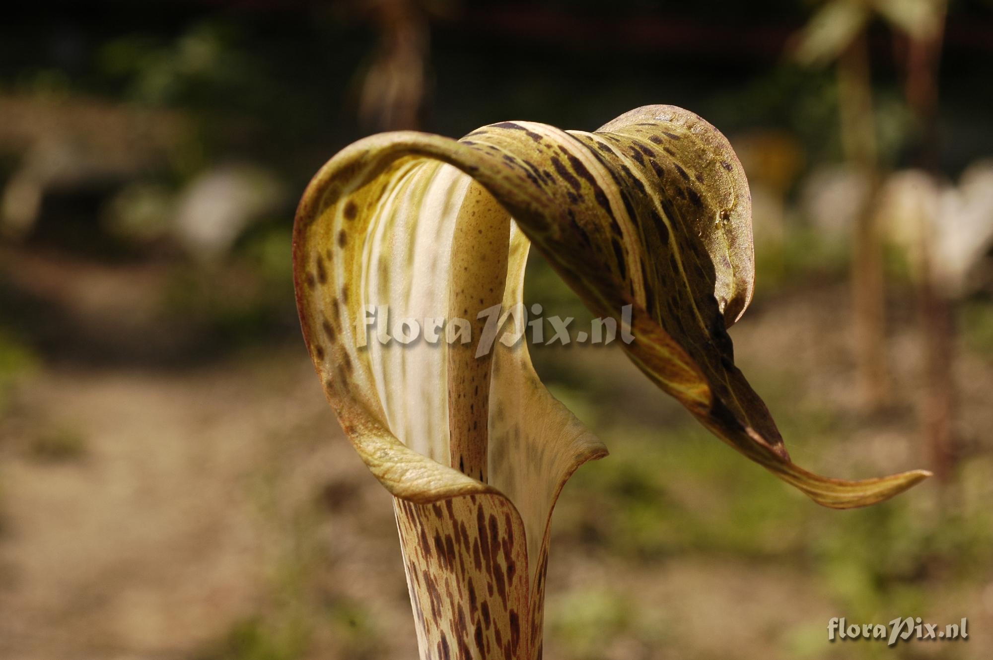 Note: A closeup of the spathe showing tha clavate spotted spadix. Tuber came from Mani Pradhan nursery (India)