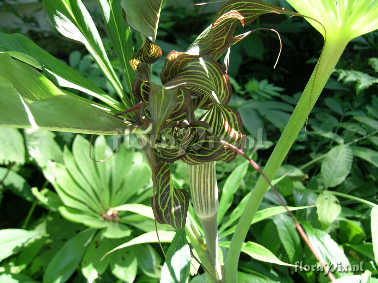 672 - Arisaema (Garden) - 2006-06-28(Dimension: 1310 x 1010 pixels - Counter: 12098) arisaema ciliatum var. liubaense ![]() (Uploaded as: Arisaema consanguineum) Photographer: Diane Whitehead Note: Grown from AEG seed by Carmen Varcoe in Victoria, British Columbia, Canada. The leaves on the flower stem have the same strong stripes as the flower. The top leaves are plain green. This is the second year of flowering, and the striped leaves have been present both years, and on all stems. Identification: Solved