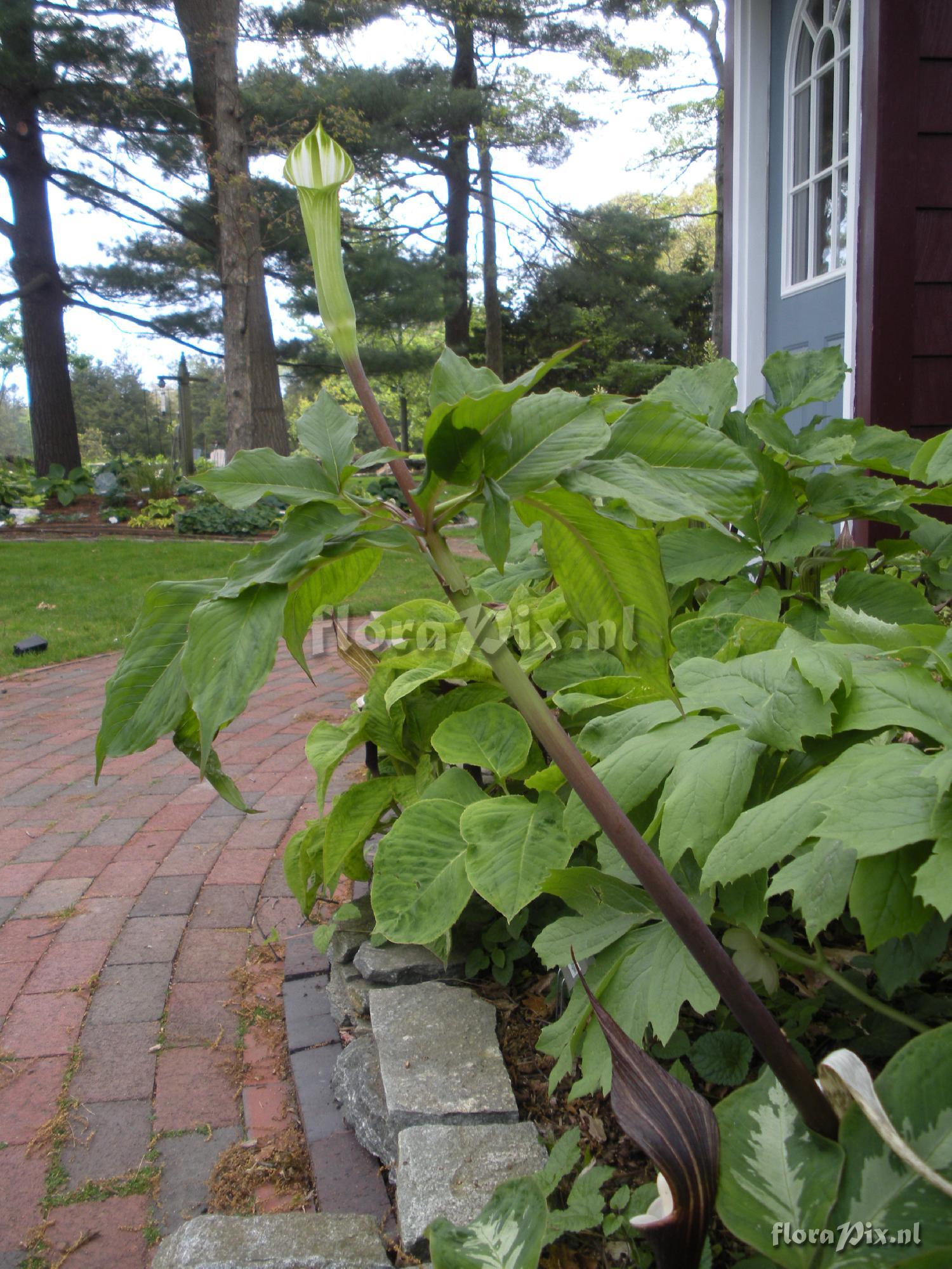 : Specimen with purple/green petiole and purple peduncle. A. sikokianum below.