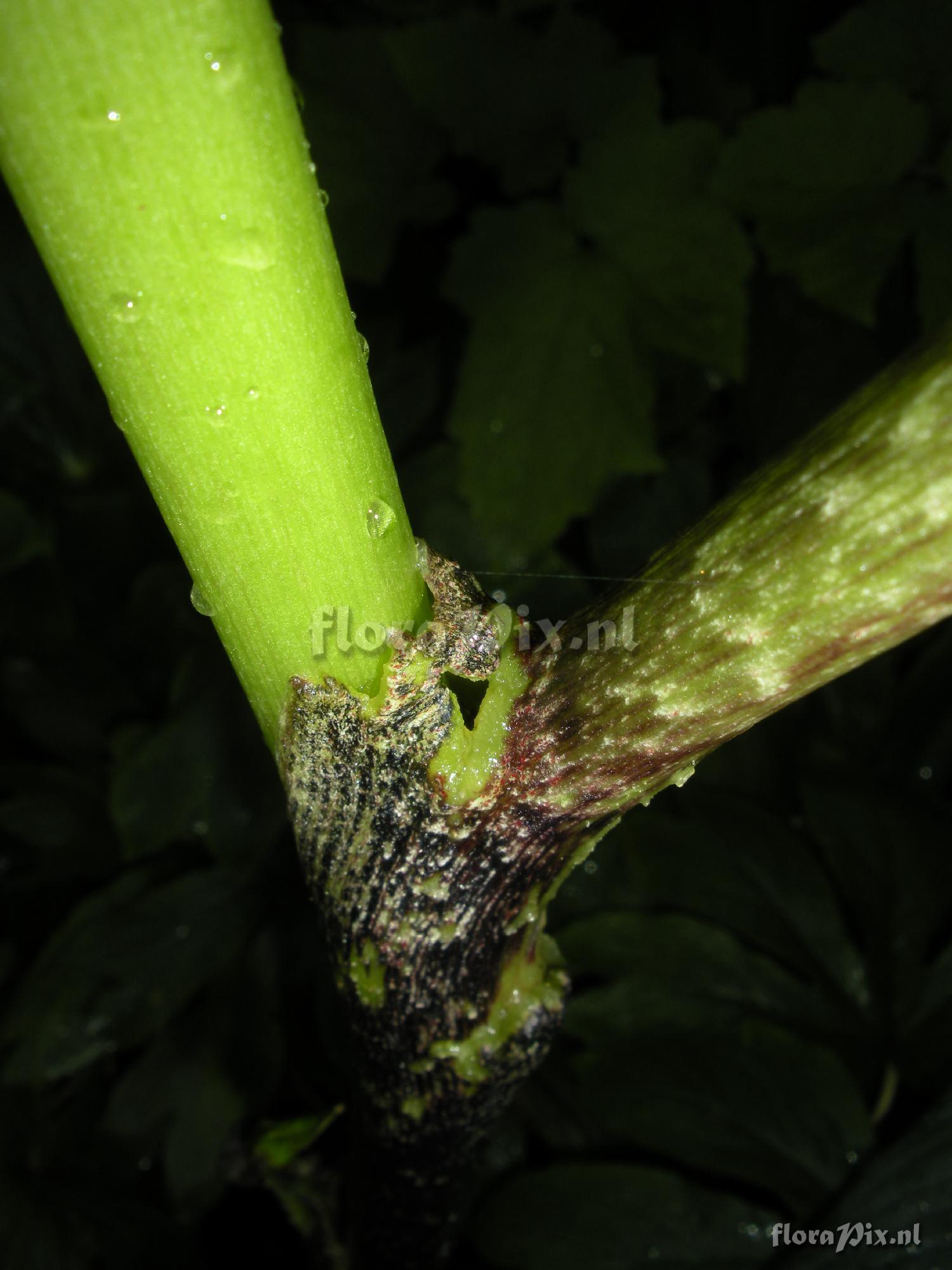 : Tissue thick, ragged, and partially missing where the petiole & peduncle meet.