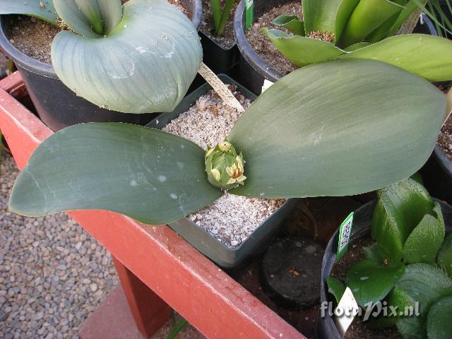 1124 - Bulbs (Garden) - 2009-01-28(Dimension: 670 x 530 pixels - Counter: 6480) Massonia echinata ![]() Photographer: Jim Shields Note: Giant form from Theronsberg Pass. This shows the whole plant before most of the flowers opened. It is in a pot 5.5 inches square. Identification: