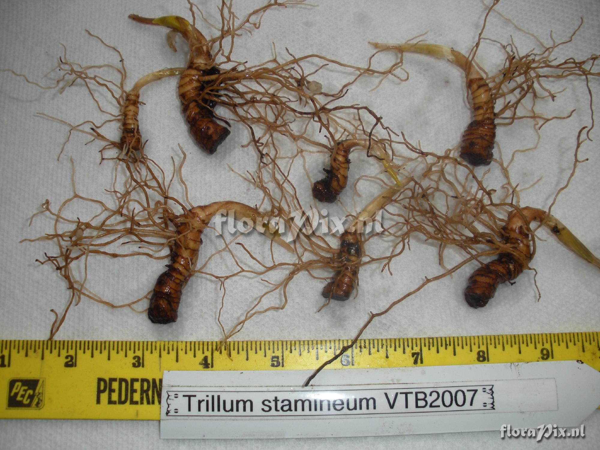 2403 - Woodland (Garden) - 2009-12-18(Dimension: 2030 x 1550 pixels - Counter: 5283) Trillium stamineum ![]() Locality: USA - Jefferson Co., Alabama - Picture taken at HBG WFNursery, Trillium Research on 17 Dec 2009. Photographer: Harold Holmes Note: Note: Rhizome shows demarcation in color before and after decapation. This is the terminal bud section that was decapated in May 2007. The lighter color part of the rhizome is growth since 2007. It may confirm John Gyer's statement that there are 3 sheeths (or whatever John calls thoes things) per year and therefore 3 rings per year. I can only guess the darker color comes from the Jefferson Co. soil and the lighter color comes from my soil mix. (Sent: Trillium-l@nic.surfnet.nl)