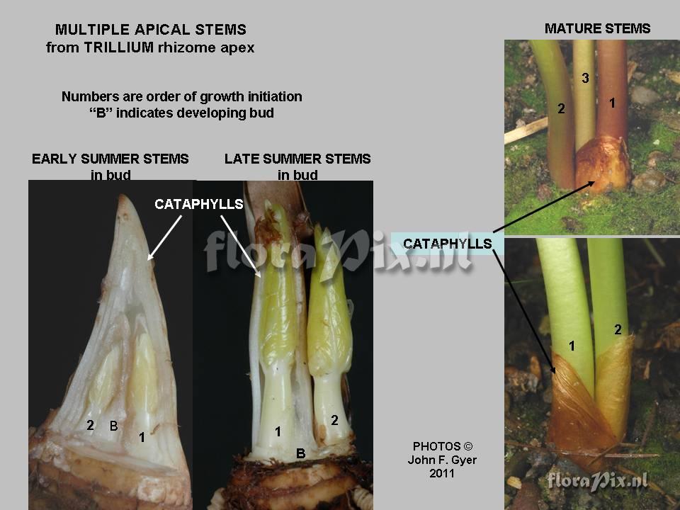 2956 - Woodland (Garden) - 2011-02-09(Dimension: 990 x 770 pixels - Counter: 6613) Trillium erectum and Trillium underwoodii ![]() Locality: USA, New Jersey - Fern Hill Farm. Clarksboro New Jersey Photographer: John Gyer Note: This composite picture shows that in a particularly strong rhizome, two or more of the buds in the apex can grow into mature stems. The size and maturity level at any time in their growth indicates the sequence of their growth initiation. Since each of these buds results in a flowering stem, they produce no additional meristems and thus the rhizome does not branch . New buds form only at the rhizome apex. (Sent: Trillium-l@science.uu.nl)