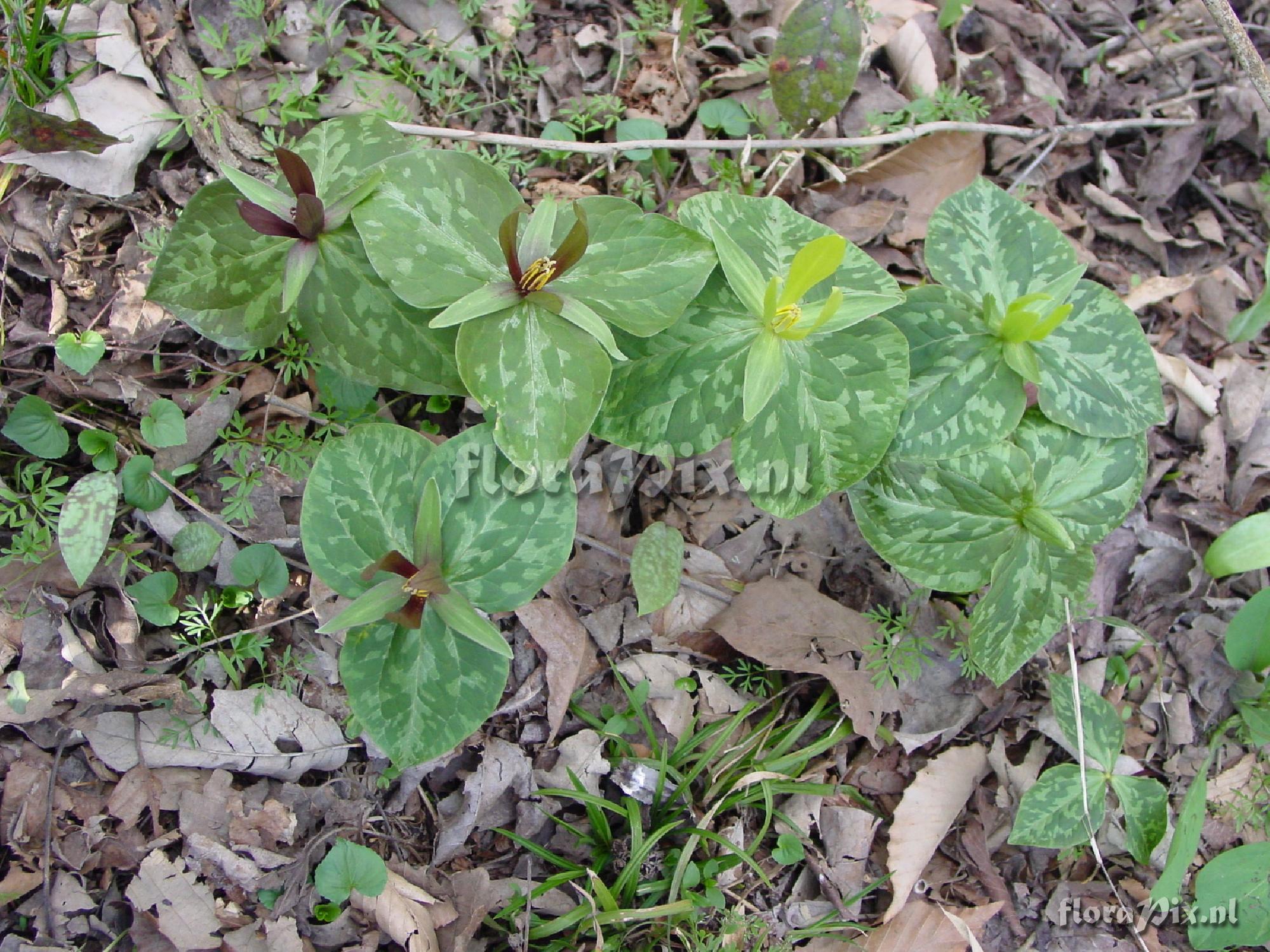 2971 - Woodland (Wild) - 2011-02-14(Dimension: 2030 x 1550 pixels - Counter: 7230) Trilliun ludovicianum ![]() Locality: USA - Tennessee - Near I-24 between Chattanooga and Manchester TN. Photographer: Harold Holmes Note: Note color forms together: green, yellow, bi-color and maroon. Note #1: This color variation were somewhat uniform throughout the population of perhaps 100 plants in a 15 meter area. Note 2: I do not know if anyone has validated that these are T. ludovicianum. (Sent: Trillium-l@science.uu.nl)